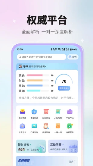 平台上聚集了数百位持有正规认证资质的周易大师,可提供命理预测、风水布局、事业规划、姻缘合婚、学业测算等多元化服务,所有服务均由真人在线实时互动完成。
