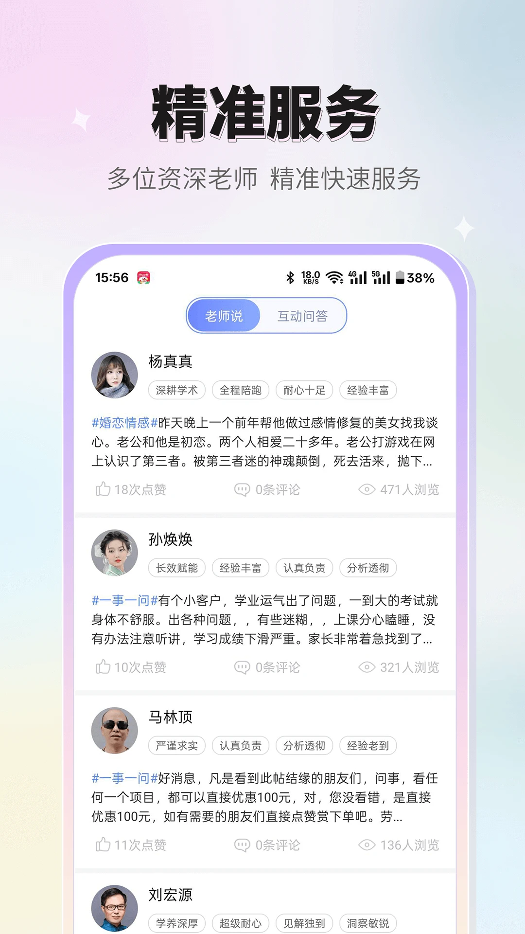 平台会不定期举办免费的大师答疑活动,用户能够在线免费提出问题,从而获得专业的解惑建议。