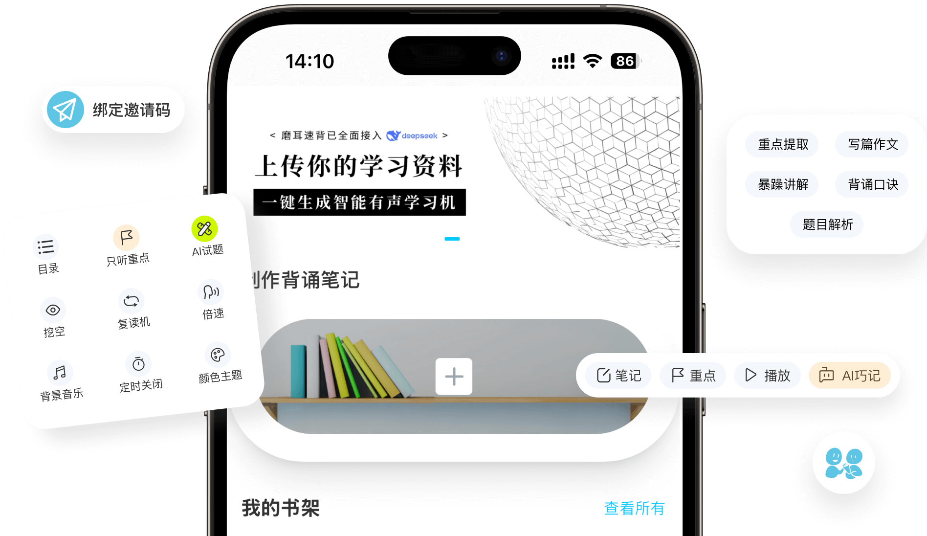 要是你正被背书的煎熬所困扰,记不住知识点,学习效率也不高,那磨耳速背便是专门为你打造的智能学习伙伴。你只需上传学习资料,它就能成为你的“随身教师”,听读、背诵、练习功能样样都有,让你无论何时何地都能掌握知识重点,高效地应对各种考试和挑战!
