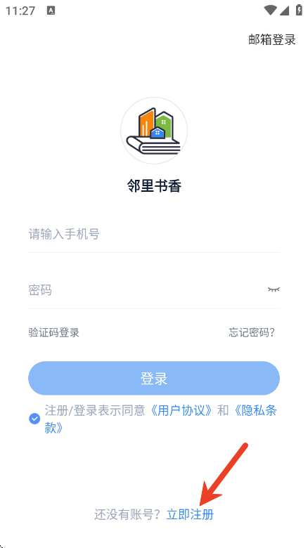 1、安装邻里书香App后,注册并登录账号,注册方式支持手机号或社区邀请码;