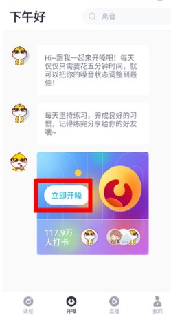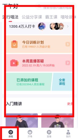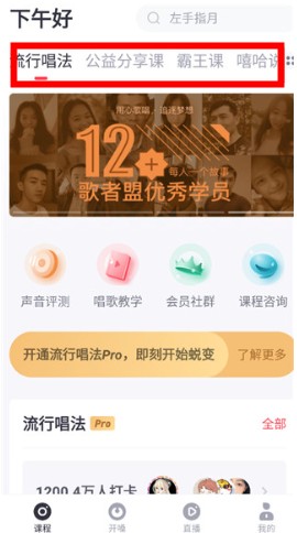 进入首页,可浏览课程、开嗓练习和直播教学等功能。