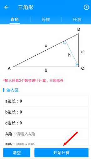 以三角形计算为例,输入相关参数后点击计算按钮,就能得到相应的结果。