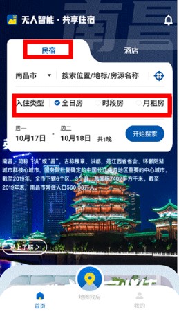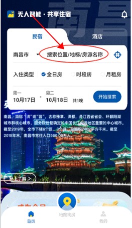 在搜索栏输入地点或房源名称,系统推荐附近选项。