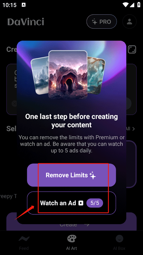 4、若你已充值会员,可点击“Remove Limits”生成;若未充值,则点击下方的“观看广告”来获取。
