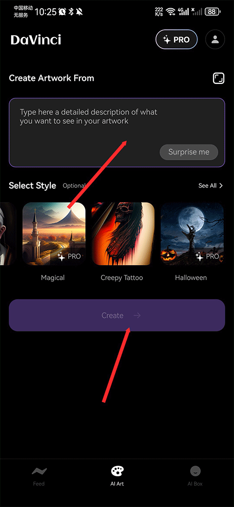3、点击后会跳转到AI Art界面,随后在顶部的文本框里输入您希望在艺术作品中呈现的详细描述,再点击create按钮。