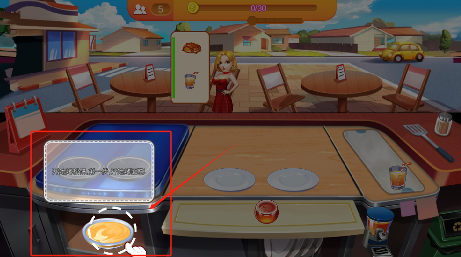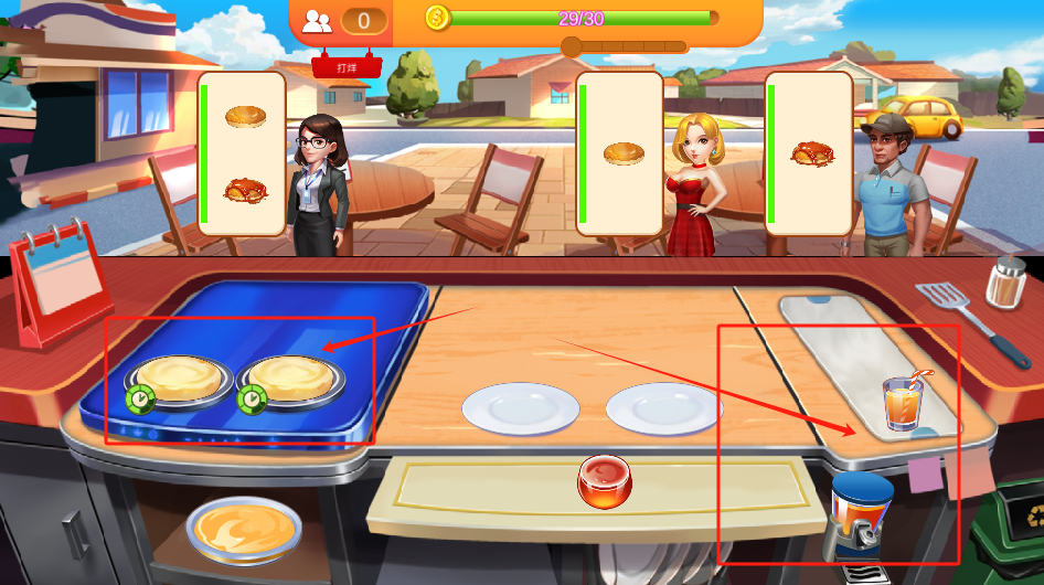 2、左边的男孩想要饮料,右边的女士需要派和蟹,得赶紧给他们制作。