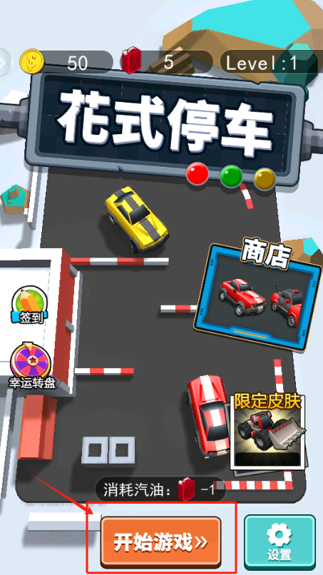 1、在主界面点击橙色的开始游戏按钮会消耗汽油,红框标注的商店内可以购买车辆。