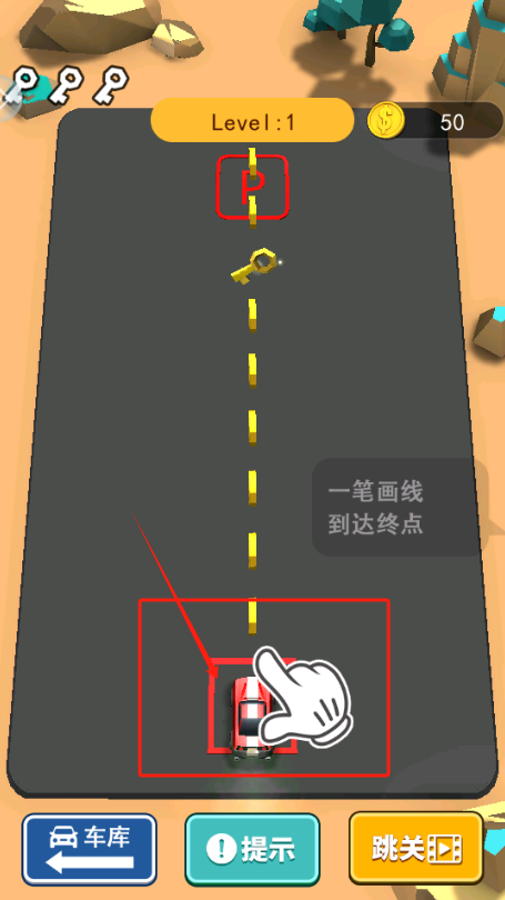 2、用手指画出路线,让红车沿着这条路线行驶,只要吃到金币和P标志就能顺利过关。