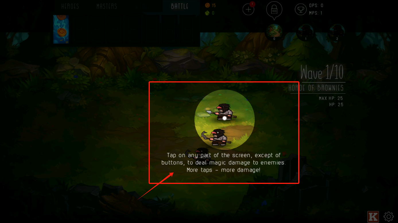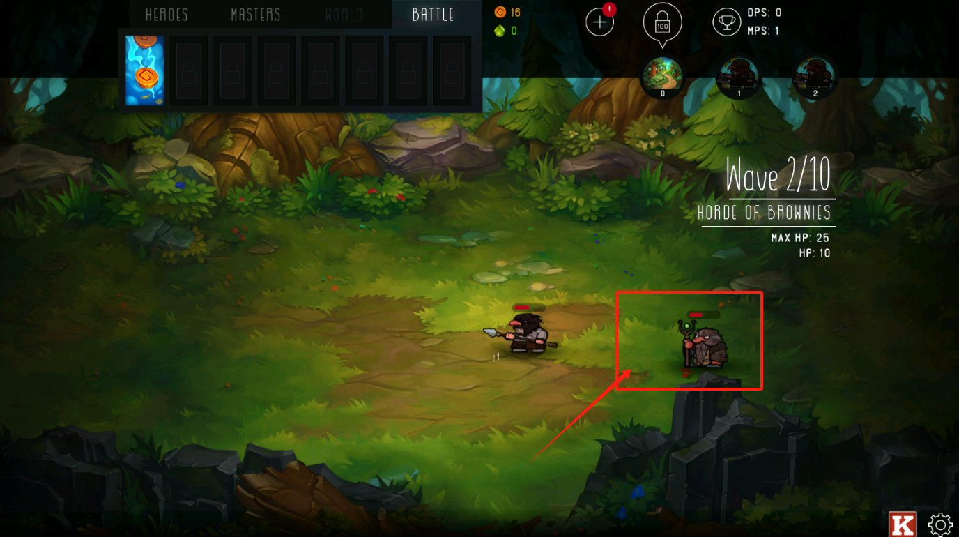 3、第二波敌人即将抵达,接下来请迅速点击攻击按钮,同时留意红框所标注的褐精灵的生命值情况。