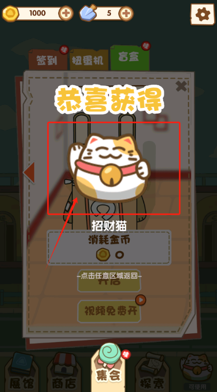 1、点击招财猫弹窗的任意位置即可关闭弹窗,若金币数量不足,可点击“免费开”领取奖励。