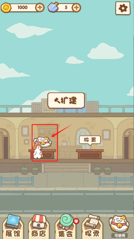 2、攒够钱点扩建按钮,有猫就点放置让它帮你赚钱。