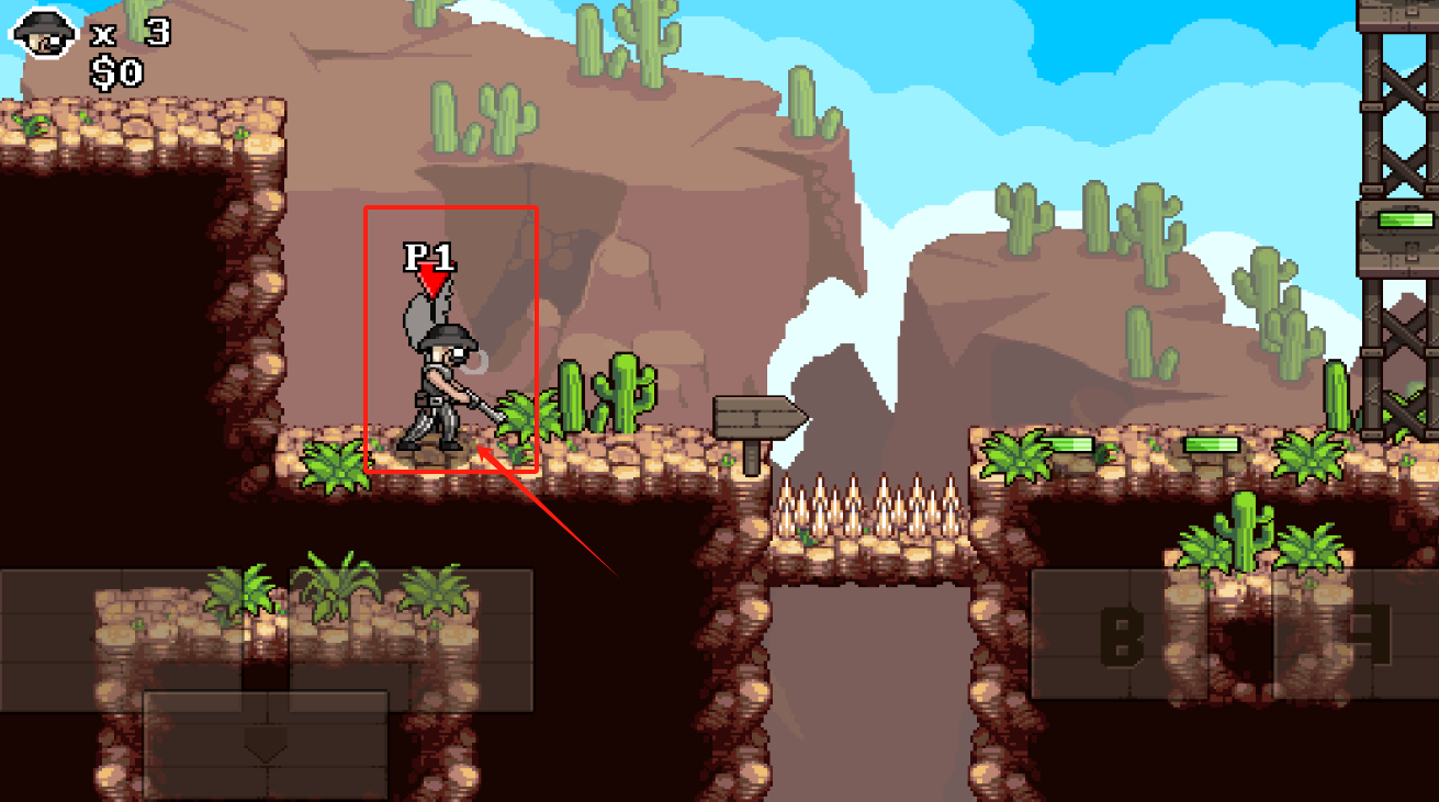 3、P1负责操控角色的移动与射击,界面会显示3条生命值以及0金钱,B键大概率对应特殊技能。