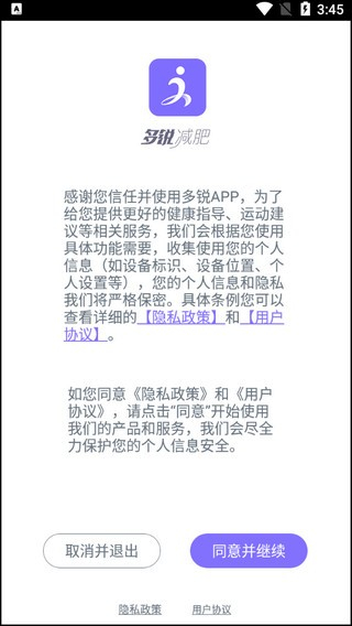 1打开多锐减肥应用后,需先确认同意用户协议政策与隐私条款,才能进一步使用应用功能。
