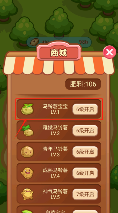 3、在商城选择马铃薯宝宝,将其升级到6级后,就可以购买更高级别的马铃薯种子了。
