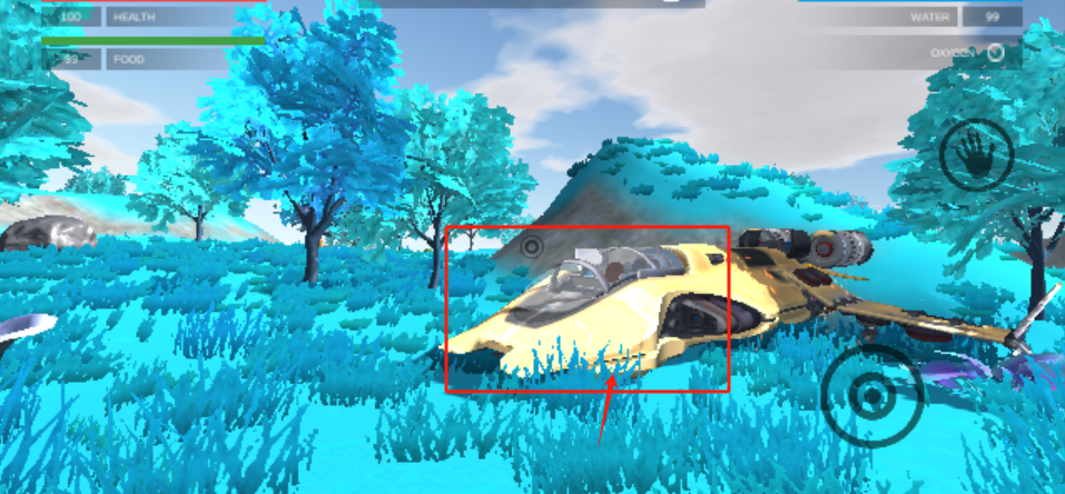2、操控角色在草地进行探索,留意上方的健康值,通过右下角的按钮来操作,黄色飞行器支持互动。