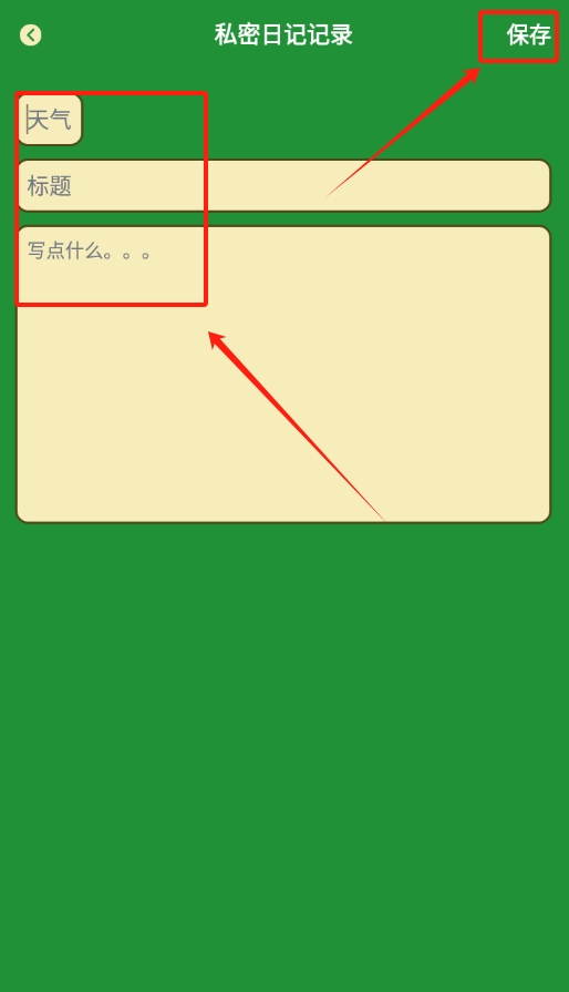 3、先填写当天的天气情况和日记标题,接着写下日记内容,确认无误后,点击右上角的“保存”按钮,这样就完成操作了。