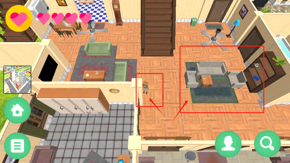 3、布置房间家具,点击沙发互动,探索地图解锁更多场景。