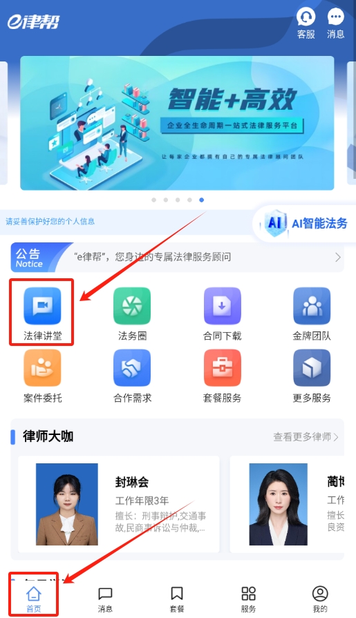 1、打开e律帮软件,在首页找到 “法律讲堂” 的按钮,直接点击进去。