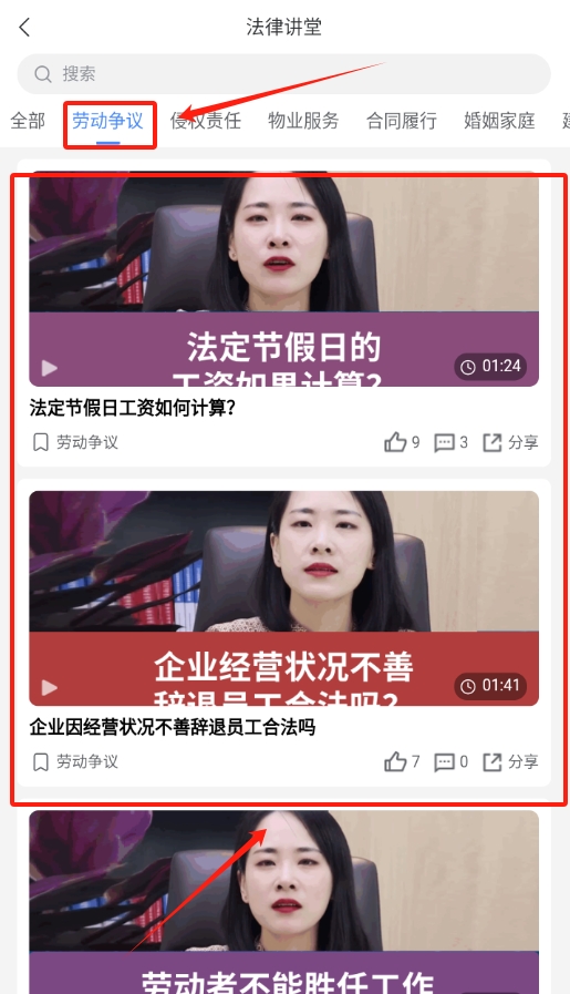 2、进入讲堂页面后,找到 “劳动争议” 分类,点击 “法定节假日工资怎么算” 的视频。