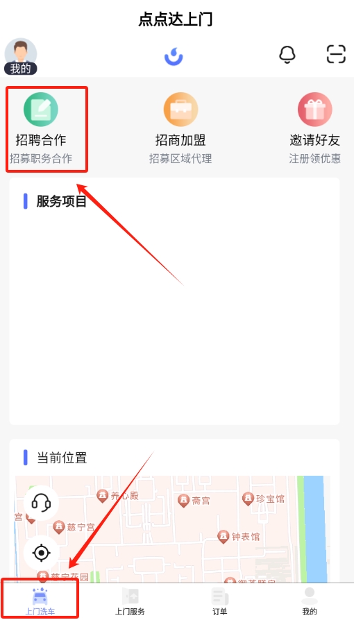 2、登录成功后回到首页,在首页找到“招聘合作”选项,点击进入合作页面。