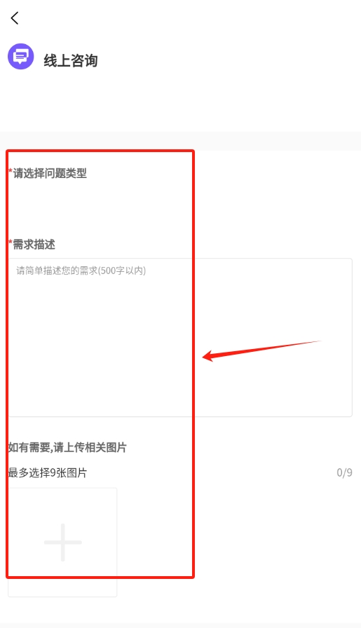 3、在咨询页面选择问题类型,详细描述您的需求,若有相关照片,可一并上传。