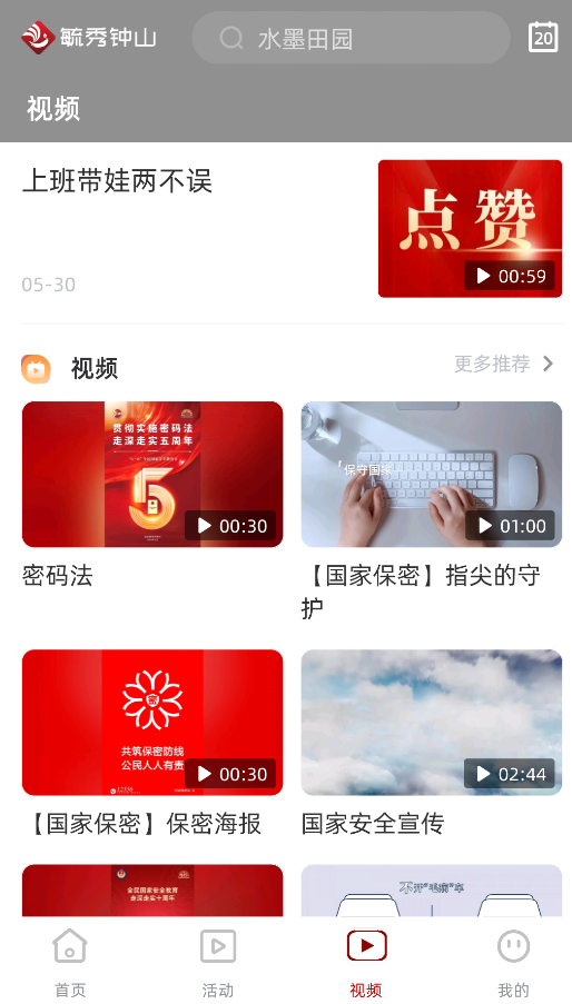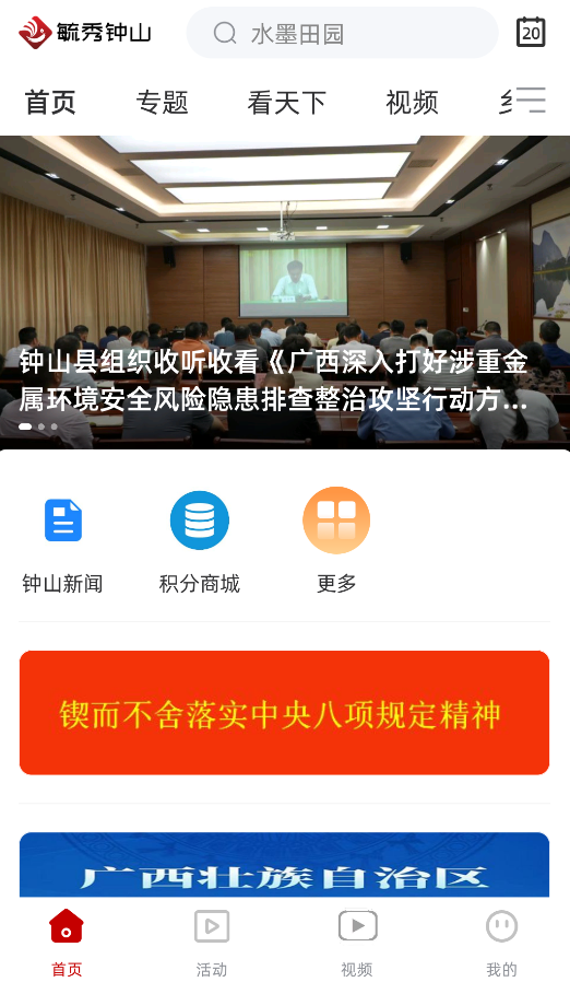 1、启动后,首页“资讯聚合”板块提供钟山本地新闻、国内专题报道,支持关键词搜索和频道订阅。