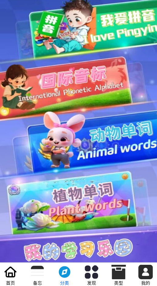 3、通过“分类”使用分类词库(如动物英语单词),配合记忆卡片功能强化背诵。