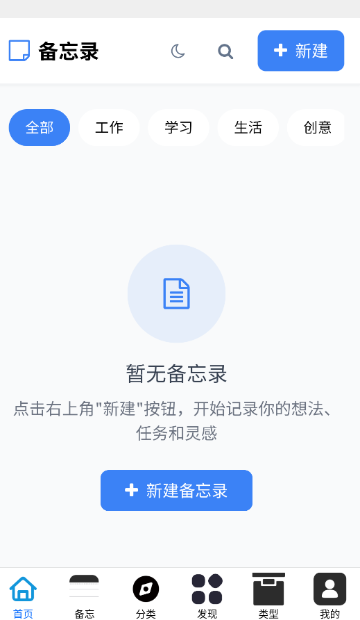 1、启动后,点击首页“新建备忘”按钮,选择类型(工作/学习/生活),支持语音转文字快速录入。