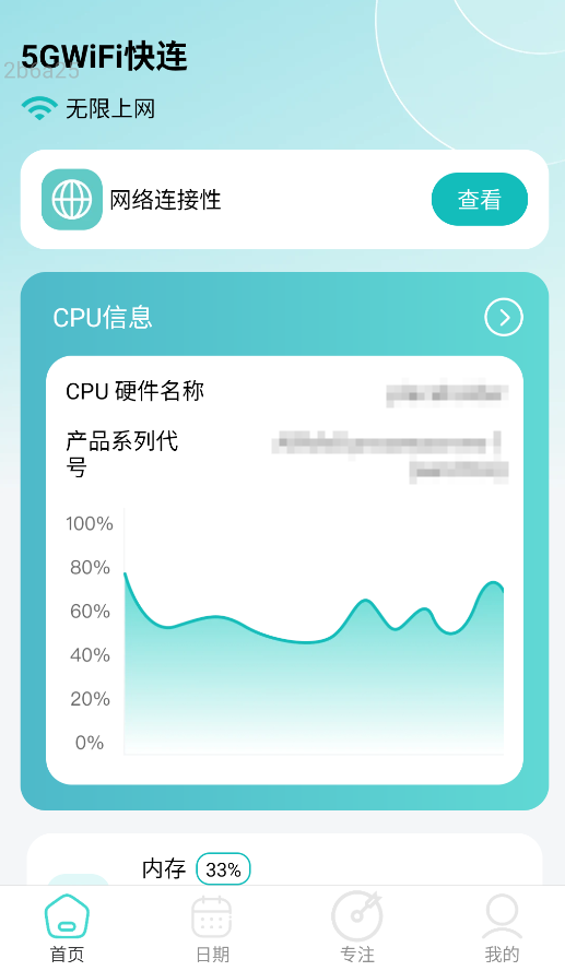 1、启动后,首页“网络检测”实时显示当前WiFi/5G的信号强度、延迟及设备CPU负载数据。