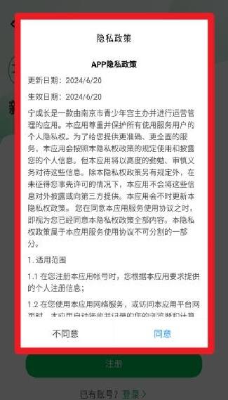 1. 首次打开宁成长应用时,系统会弹出隐私政策提示,用户需仔细阅读后点击同意按钮,在确认接受信息保护相关条款后,即可继续使用该应用。