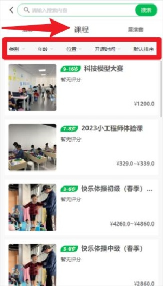 5. 课程页面上有不少课程可供挑选,家长可以根据类别、孩子年龄、活动位置和开课时间等条件进行筛选,以便直接为孩子报名合适的课程活动。