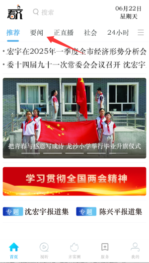 1、打开看齐通后,在首页的导航栏里找到“要闻”板块,点击进入该板块。