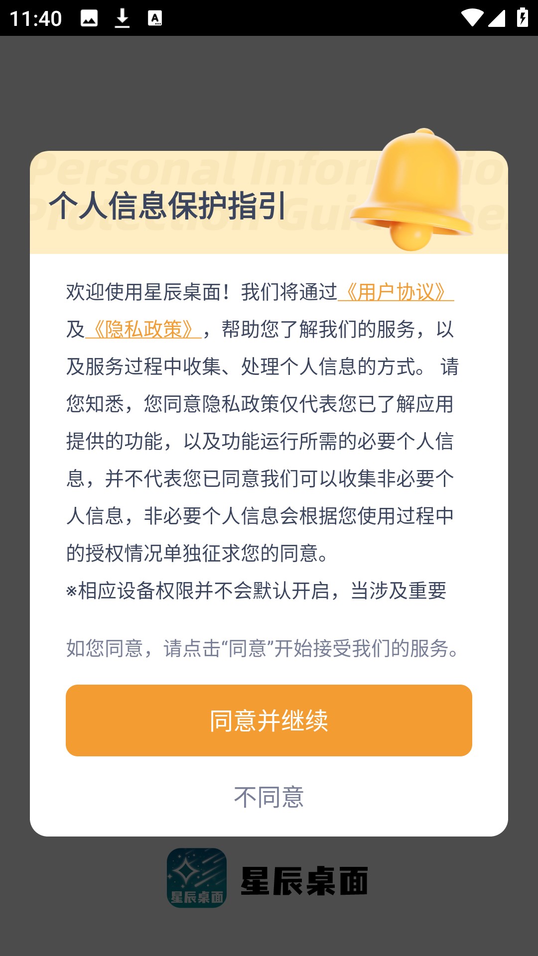 1、打开星辰桌面,首次使用时同意相关条款,如有需要可查看协议内容。