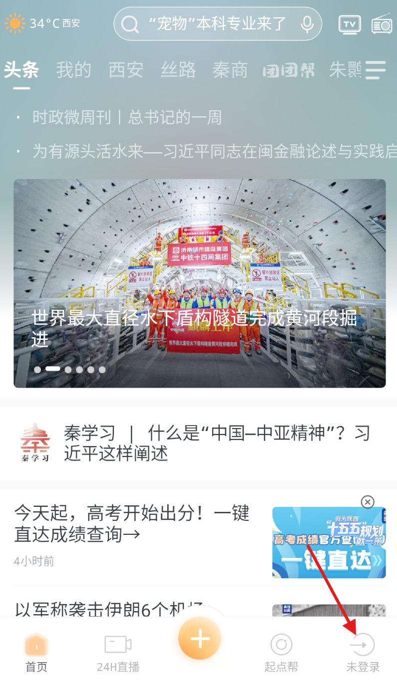 1、启动起点新闻应用,点击导航栏里显示的“未登录”按钮。
