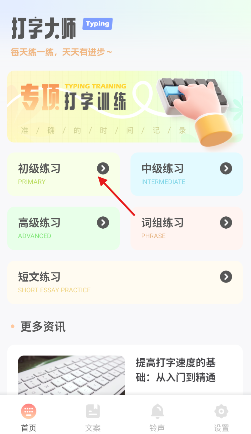 1、启动打字通软件后,在软件的首页界面能够看到初级、中级、高级、词组、短文等不同类型的练习模块。