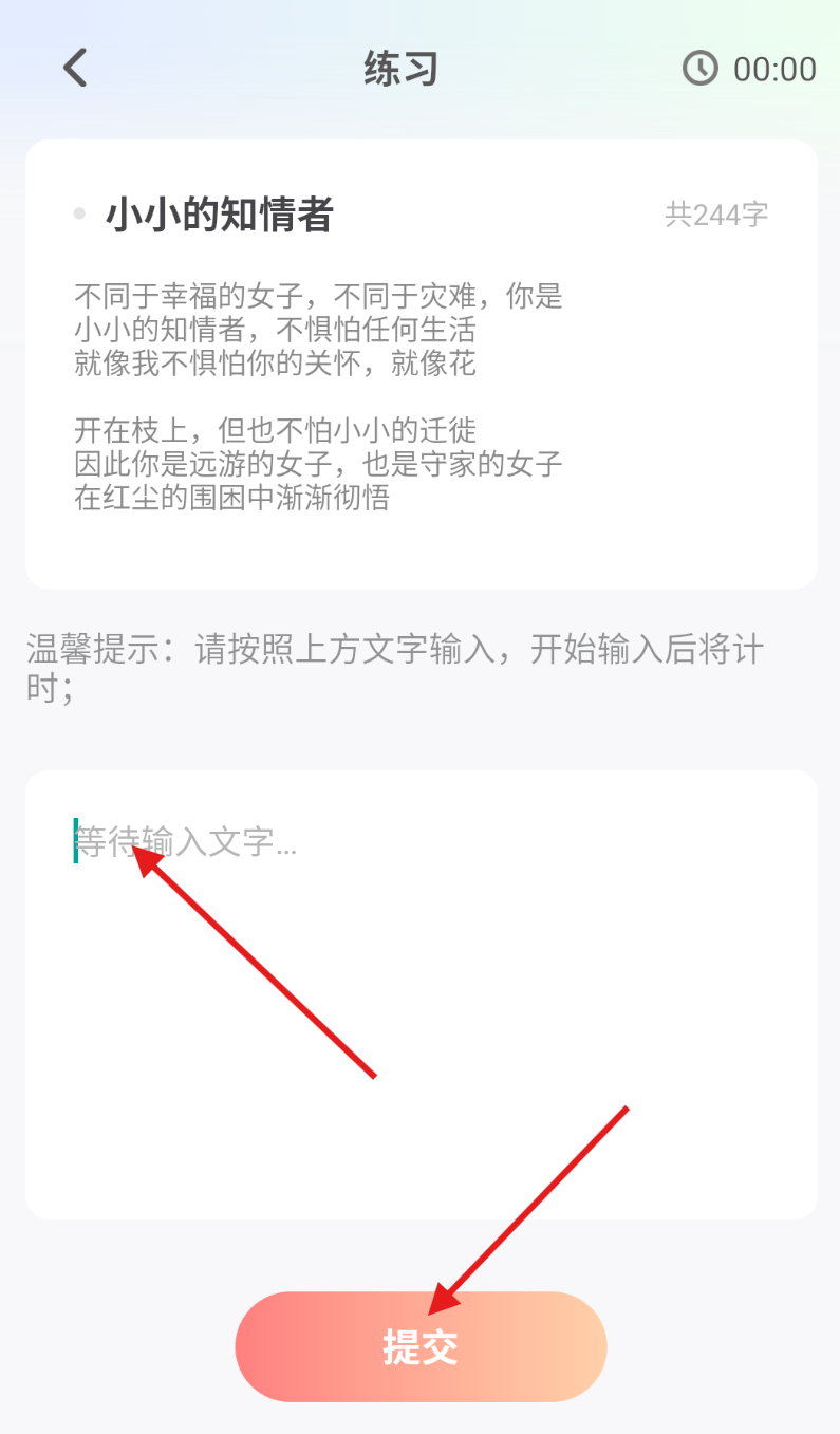 4、进入练习界面后,在待输入文字的文本框中填写相应内容,全部完成后点击提交按钮。