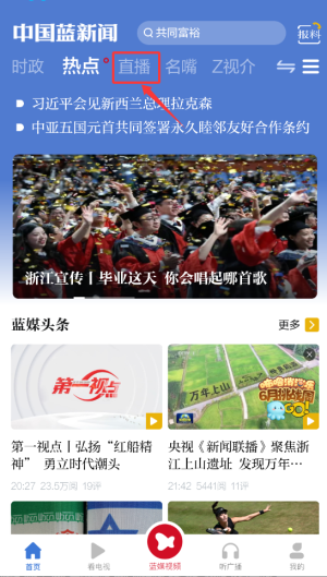 1、打开中国蓝新闻应用,进入首页后,在顶部导航栏里找到“直播”频道并点击进入。