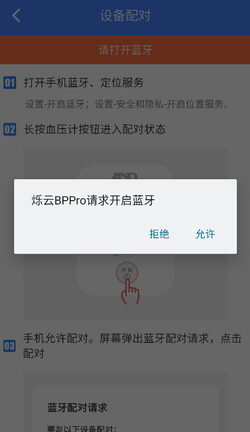 1、设备连接步骤:开启手机蓝牙→打开设备管理→选择血压计型号→完成配对连接。