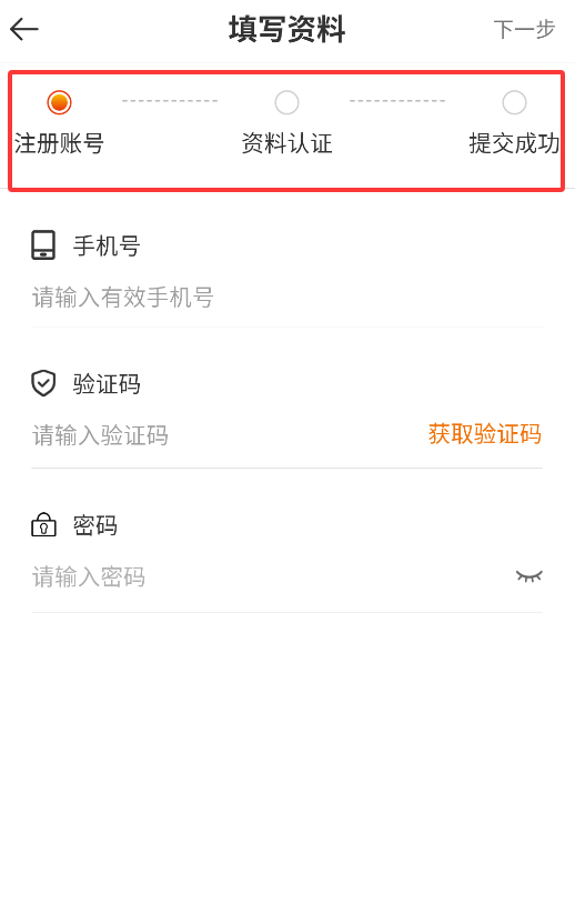 完成注册流程后跳转至认证界面,拍摄并上传所需证件材料,随后等待平台完成审核并通过。