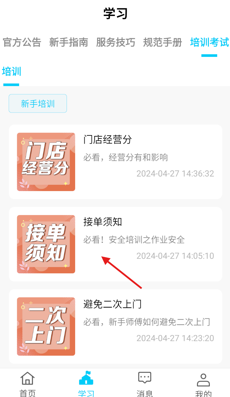 3、在培训考试列表页中,浏览展示的新手培训内容,随机选择一项点击进入详情页。