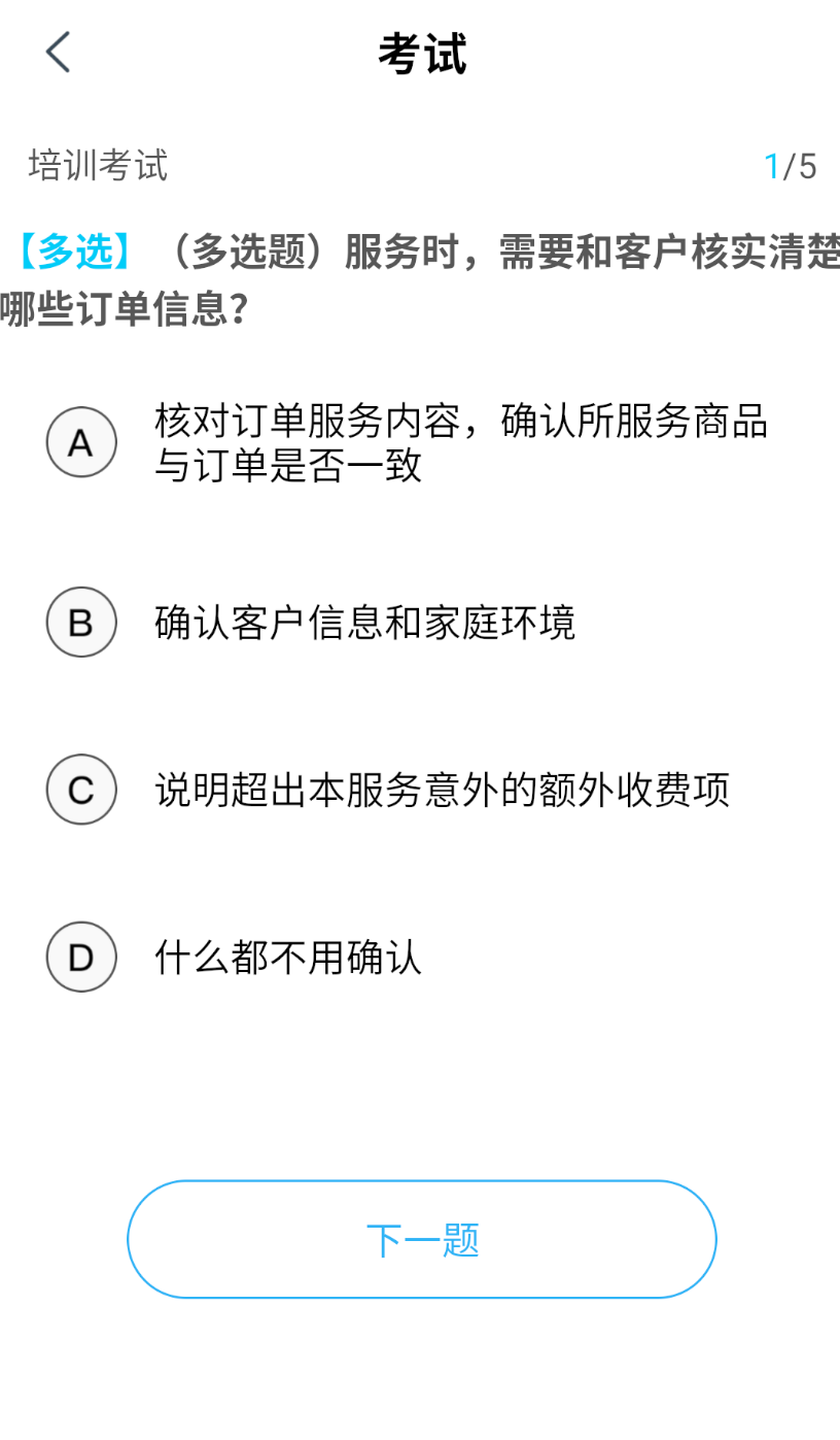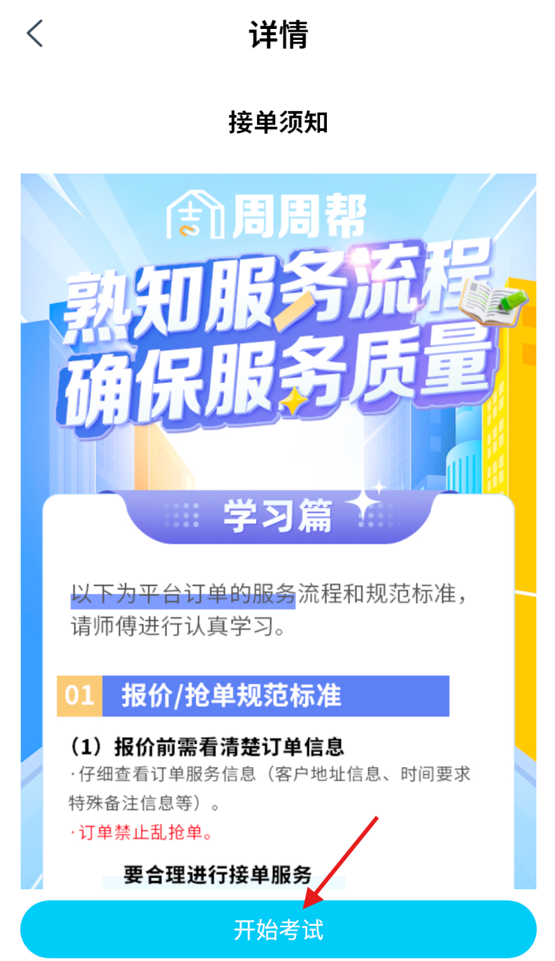 4、在选中的培训内容详情页中,在页面底部,点击 “开始考试” 按钮,进入考试界面。