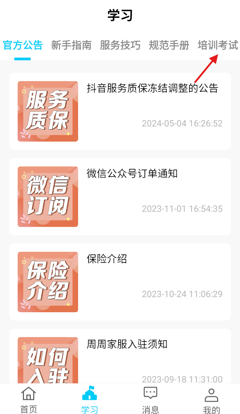 1、打开周周家服软件,在底部导航栏中找到并点击 “学习” 选项,进入学习中心页面。