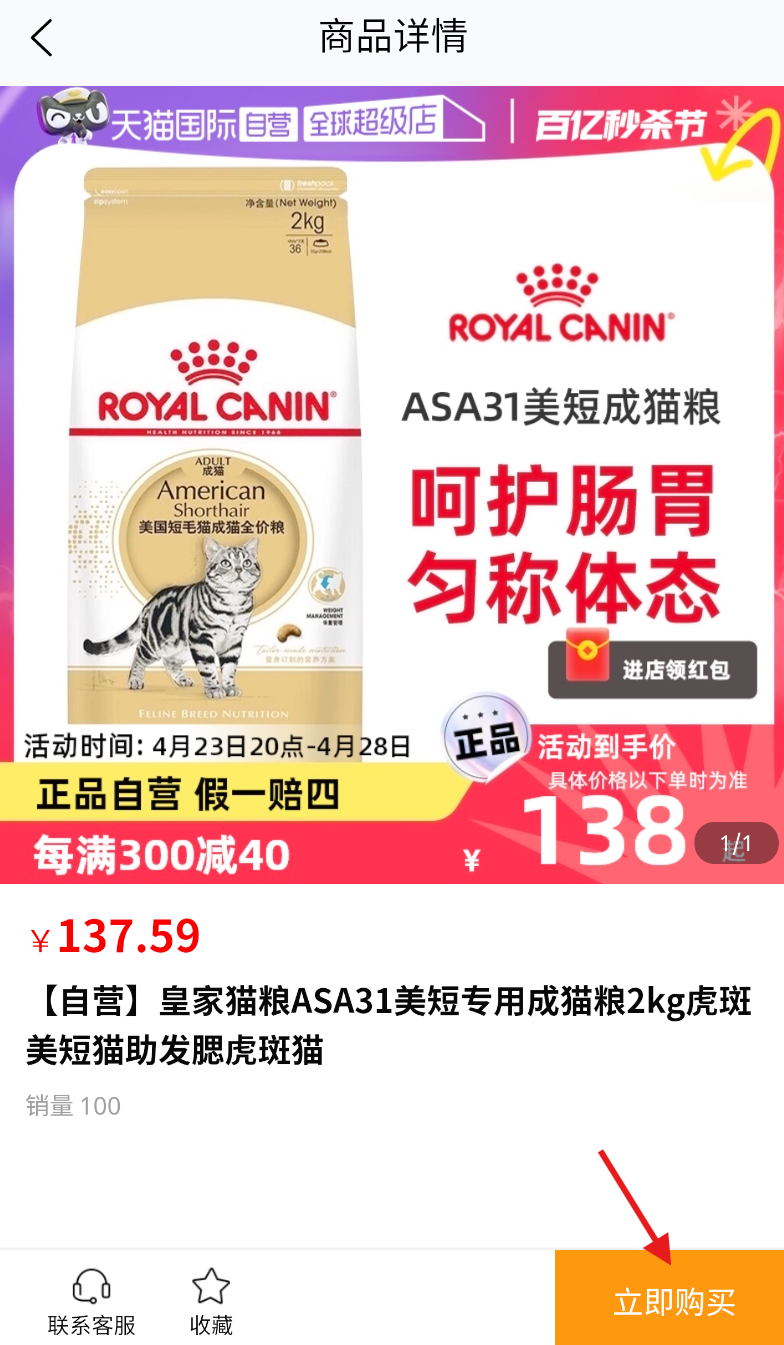 2、跳转到宠物商品页面,浏览各类猫粮商品,挑选出感兴趣的款式并点击进入详情页查看。