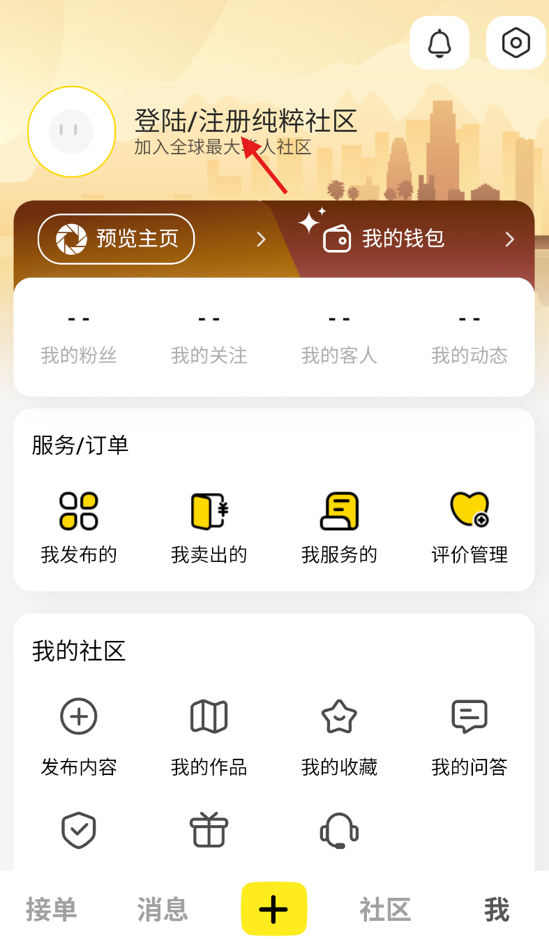 2、在“我”的页面里,找到显眼的“登录/注册纯粹社区”选项,点击该选项即可进入注册流程界面。