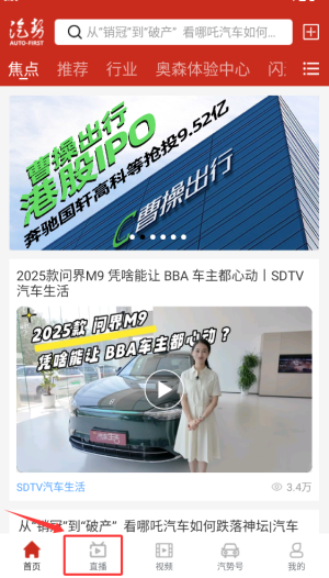 1、启动汽势后,在首页导航栏选择"直播"频道,这里展示各类汽车相关直播内容。