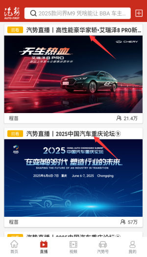 2、视频直播板块提供新车发布会、试驾测评等实时内容。支持多机位切换,关键参数实时标注。