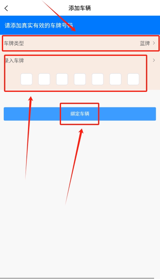 3、操作步骤如下:首先选择对应的车牌类型,接着准确输入车牌号,最后点击“绑定车辆”按钮,即可完成绑定操作。