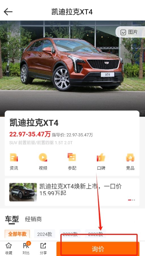 2、选好具体的汽车型号,找到右下角的 “询价” 按钮,点击就能开始问价格。