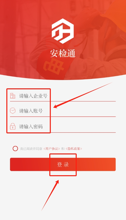 3、进入登录界面后,在相应位置依次填写企业号、账号与密码,核对信息准确无误后点击登录按钮,就能进入安检通软件。