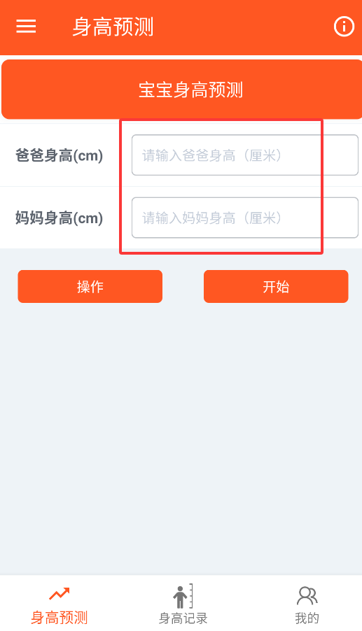 1、启动后,进入“身高预测”功能,输入父母身高(厘米单位),系统自动匹配遗传算法模型。